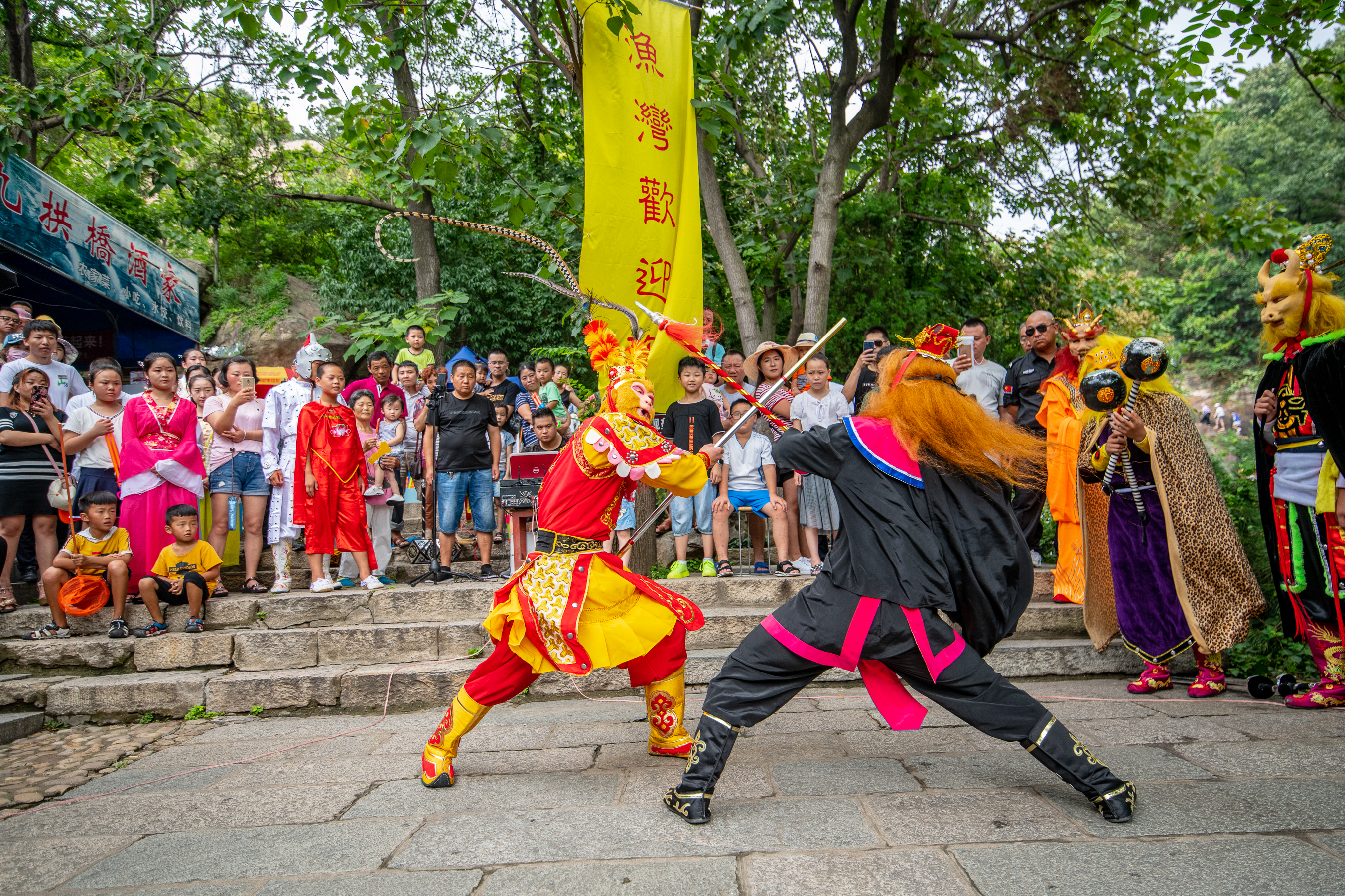 在漁灣廣場、九孔橋、龍祈洞、老龍?zhí)兜鹊?,孫悟空、四海龍王、哪吒等西游人物活靈活現(xiàn),為廣大游客送去“大鬧東海龍宮”、“小白龍大戰(zhàn)二郎神”、“哪吒大戰(zhàn)三太子”等西游經(jīng)典片段,精彩打斗真材實(shí)料,令人目不暇接;節(jié)目編排新奇有趣,贏得了游客們的陣陣喝彩。