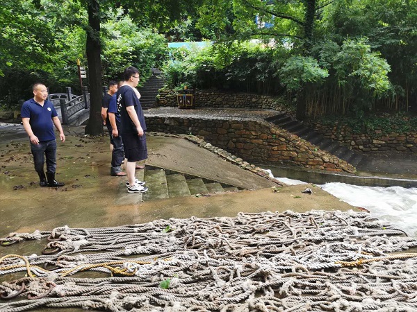 7月11日下午,文旅集團(tuán)董事長江頌青通過視頻會(huì)議傳達(dá)云臺(tái)山景區(qū)管委會(huì)關(guān)于防汛緊急通知,要求全力做好各項(xiàng)防御準(zhǔn)備。公司會(huì)后立即組織員工巡堤查險(xiǎn),提前預(yù)降漂流塘壩水位,檢查河道是否有積澇隱患,對吊具、電子屏、鐵皮房、漂流艇等戶外設(shè)施進(jìn)行加固處理,所有設(shè)備統(tǒng)一斷電,嚴(yán)格落實(shí)24小時(shí)專人值班和領(lǐng)導(dǎo)帶班制度,每隔半小時(shí)組織巡查,兩人一組,及時(shí)匯報(bào)汛情,確保安全度汛。