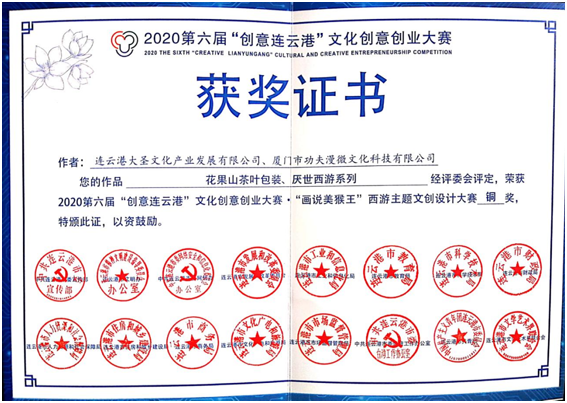 近日,由連云港市委宣傳部(市文改辦)主辦的第六屆“畫說美猴王”西游文化主題文創(chuàng)設(shè)計大賽獲獎情況公布,大賽共評出金獎5項、銀獎15項、銅獎43項、優(yōu)秀獎若干。大圣文化選送的花果山茶葉包裝系列、厭世西游系列榮獲銅獎。